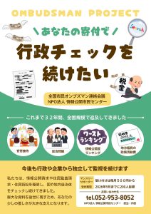 全国市民オンブズマン連絡会議は1994年秋に発足しました。以来、会費と会員や支援者個人の方々の寄附に支えられて活動をしてまいりましたが、会員の高齢化等によって会費や寄附収入が減少し、2026年以降は事務作業を担当しているNPO法人情報公開市民センターの事務職員への給与の支払いを停止せざるを得ない状況となってしまいました。