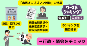 市民オンブズマンとは、行政の税金の無駄遣いや違法行為を市民の立場から追及する市民団体です。弁護士や公認会計士などの専門家だけでなく、退職者・主婦など一般市民が市民オンブズマン活動に参加しています。全国各地には加盟する市民オンブズ団体が60あり、それらが連携を取り「全国市民オンブズマン連絡会議」を1994年に結成し、一斉追及や調査、全国大会を行っています。